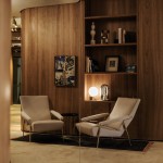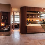Materiali naturali, come la roccia calcarea, la pelle e il marmo, si combinano con le rifiniture in ottone brunito contribuendo al fascino glamour che emana in tutto lo spazio dall’ampio uso di ciliegio nero massello o impiallacciato.