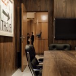 Le porte degli uffici sono state create con un sistema di giunzione a tenone e mortasa, usato per secoli allo scopo di ottenere finiture solide e senza saldature. La lastra di legno di 45 mm è stata tagliata a mano, levigata e oliata e gli intarsi in vetro ottimizzano il flusso della luce naturale nello spazio di lavoro.