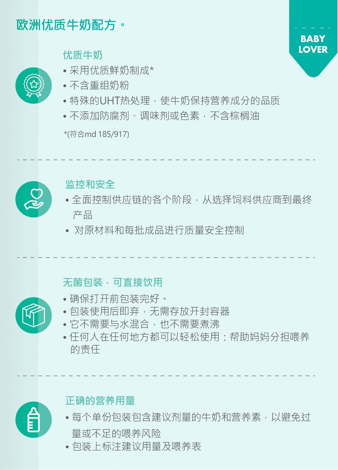 由于用优质饲料喂养奶牛,并根据儿童生长的每个阶段添加均衡的营养成分,优质婴幼儿配方液态奶是适合从断奶到3岁健康均衡饮食的成分。