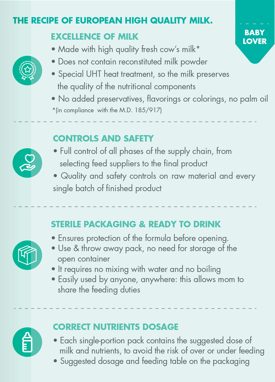 Thanks to cows fed with quality feeds and to the adding of a balanced mix of nutrients selected for each phase of the child growth, the premium liquid infant formula milk is a component suitable for a healthy and balanced diet from weaning to the 3rd year of life.
