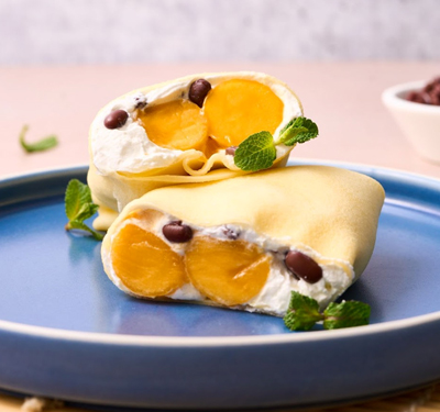 将薄饼放在盘子上,加入几片芒果、红豆和一大勺生奶油,然后卷起来。切成两半呈盘,用新风轮菜叶和糖粉点缀。