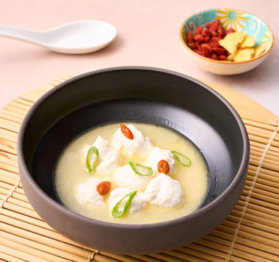 准备好后,与热汤一起食用。用切丝的葱、几片白萝卜、枸杞和少许特级初榨橄榄油点缀。